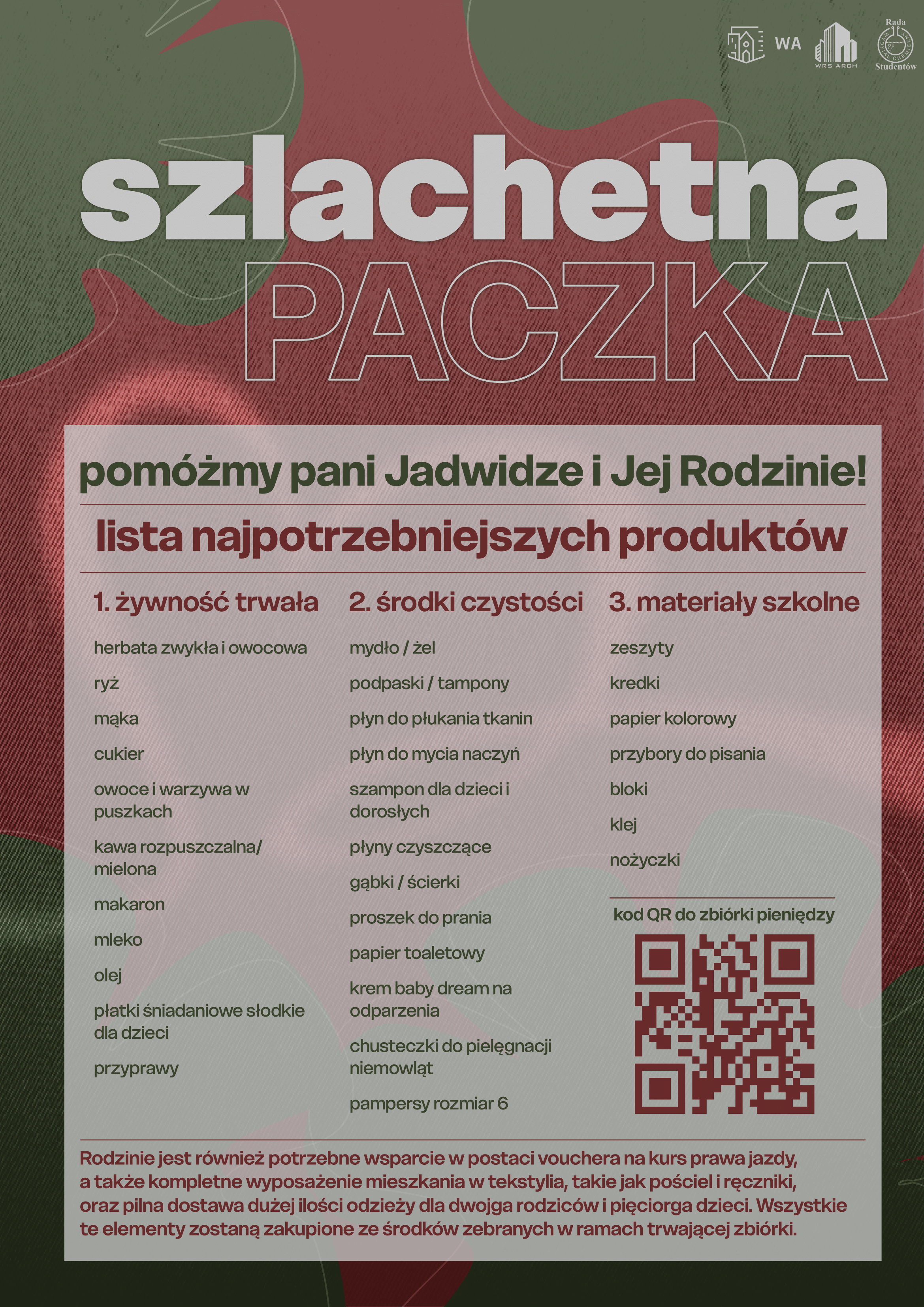 W tym roku Wydział Architektury podjął wyjątkową współpracę z Wydziałem Chemicznym. Postanowiliśmy połączyć siły i wspólnie przygotować Szlachetną Paczkę dla potrzebującej rodziny.